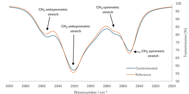 Such molecules contain two different kinds of C-H bonds: those in -CH2– groups and those in -CH3 groups, with slightly different infra-red signatures. The ratio of the absorption intensities for CH2 and CH3 can be calculated, and oil mixtures containing more longer chain alkanes will have a higher ratio. An increase in this ratio is often caused by evaporative loss of the lighter fractions due to elevated operating temperature, though polymerisation is also possible. To explore this further, we use mass spectrometry to definitively separate out the different molecular fragments.