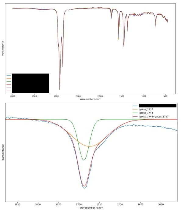 We have developed our own custom Python toolkit for these sorts of quantitative analyses. In the spectra below, we separated out contributions from aldehydes and carboxylic acids and corelated them with other markers in the spectra to assess the degree of oxidation of the base oil.